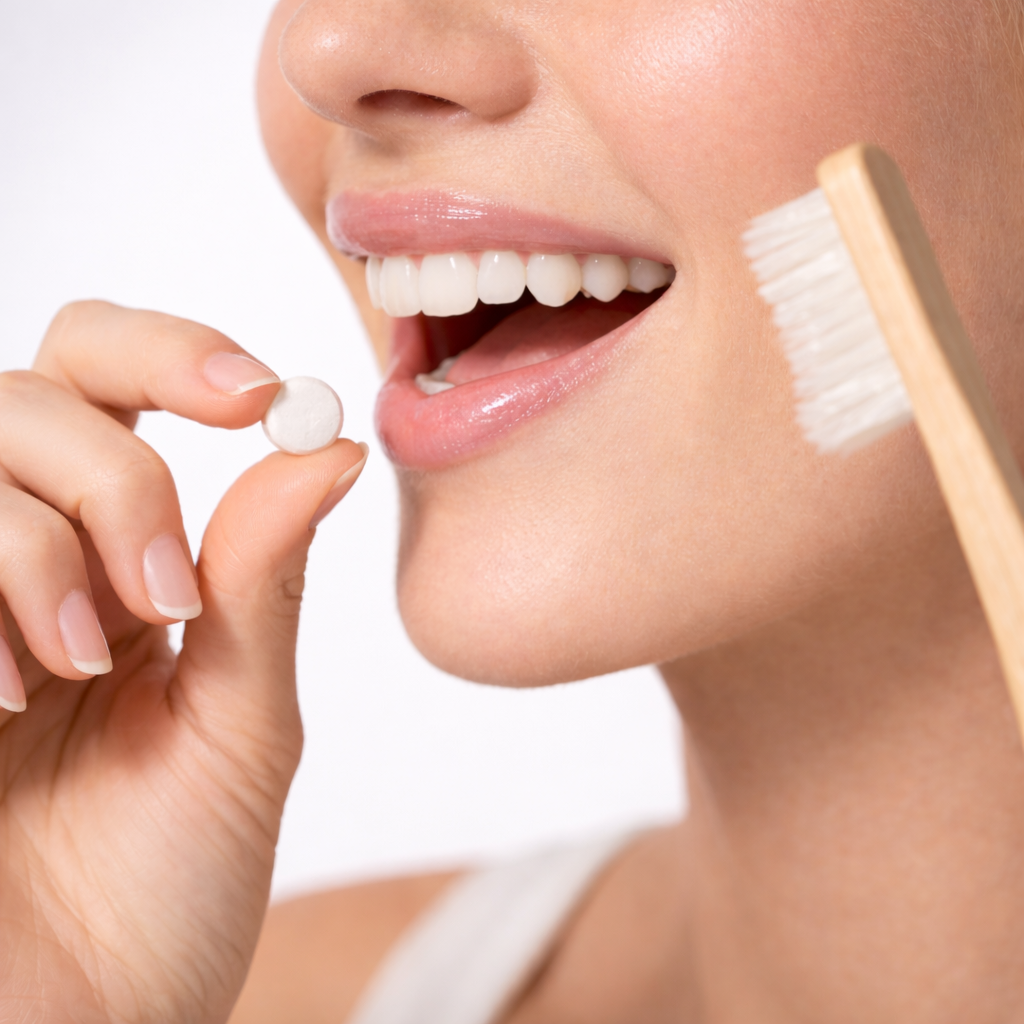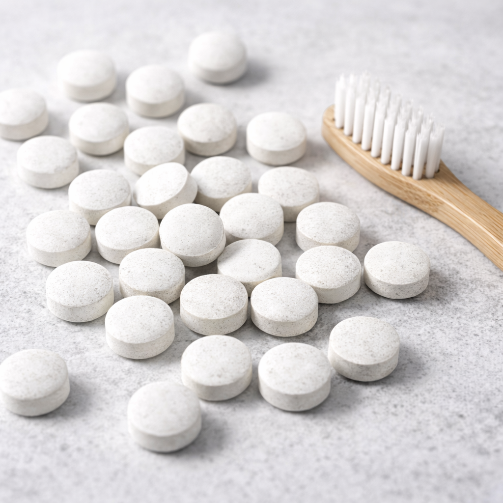 Each tablet delivers a perfectly portioned clean. Simply chew the tablet, brush with a wet toothbrush, and rinse.